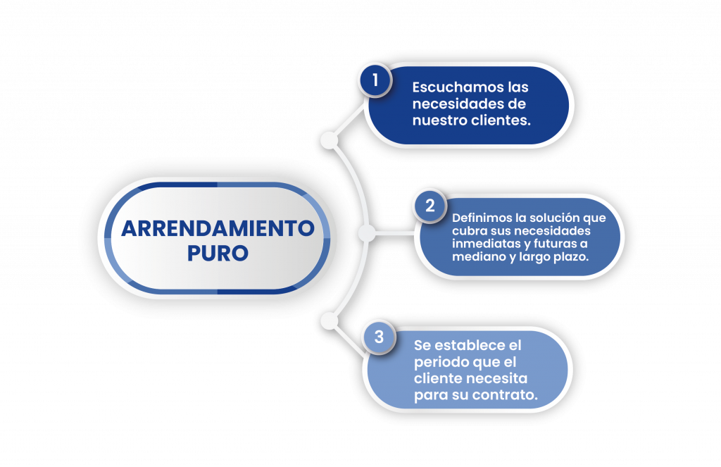 El arrendamiento puro implica un contrato en el cual ICS facilita el uso de los equipos a la empresa a cambio de pagos periódicos acordados durante un período determinado. Al finalizar el contrato, la empresa tiene la opción de renovar el arrendamiento, actualizar los equipos o adquirirlos definitivamente a un valor residual predeterminado.